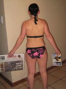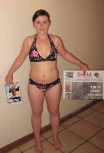 The 12 week challenge requires that you take a photograph on the first day of your challenge with a local newspaper to be proof of your actual start date. My sister Mashinke came over this afternoon to take my before photograph…I was just shocked once again when I saw myself in that bikini in which I felt so comfortable in a year or two ago…Seeing this photograph just made me realize again how bad I really want to reach the end of this 12 week challenge.